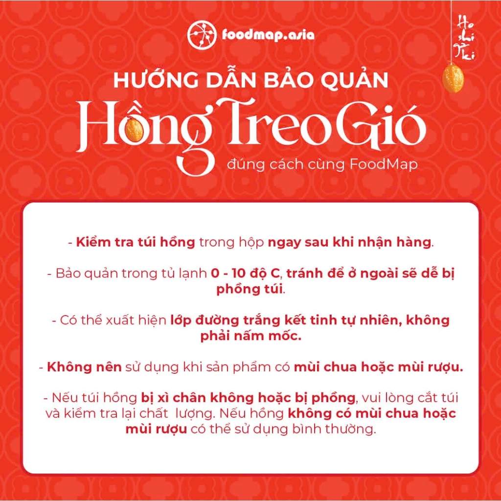 Nên bảo quản trong tủ lạnh, sản phẩm cũng sẽ ngon hơn khi để tủ lạnh rồi mang ra ăn. Hồng treo gió tại FOODMAP là sản phẩm được làm hoàn toàn tự nhiên, không chất bảo quản đặc biệt không sử dụng lưu huỳnh trong quá trình sản xuất nên nếu khách hàng mua về chưa sử dụng ngay nên để vào ngăn mát tủ lạnh để sản phẩm được bảo quản tốt hơn. Nếu được bảo quản từ 3 - 5 độ, sản phẩm có thể sử dụng được lên đến 1 năm.