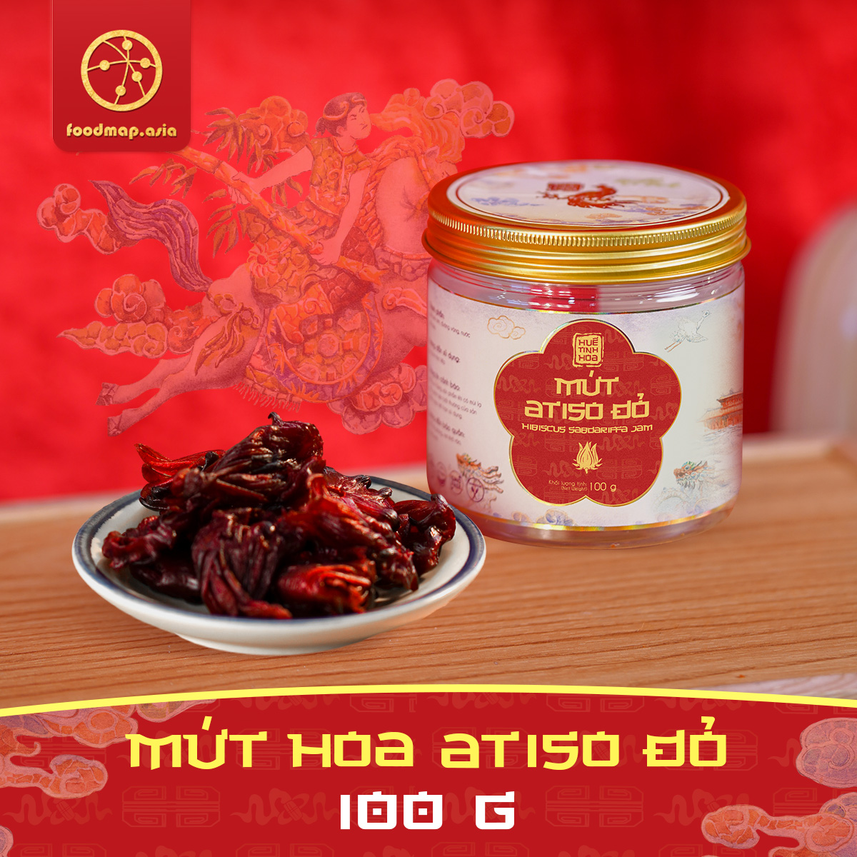 Mứt Atiso Đỏ – đặc sản Huế – là món mứt thanh mát, ngọt dịu được chế biến từ đài hoa atiso đỏ kết hợp với đường. Sản phẩm giữ trọn hương vị tự nhiên của atiso đỏ, mang lại trải nghiệm thưởng thức thanh nhã, bổ dưỡng, rất phù hợp cho mâm bánh mứt Tết Việt Nam.