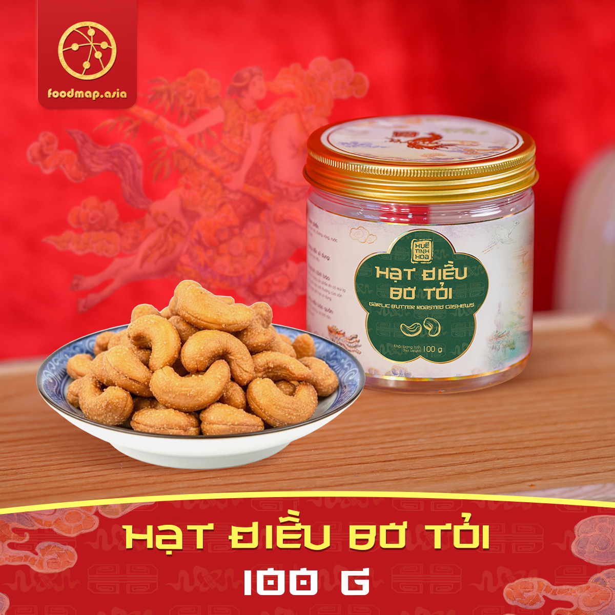 - Thành phần: Hạt điều (90%), bơ thực vật (5%), tỏi sấy (3%), đường mía, muối biển, tiêu trắng (2%)