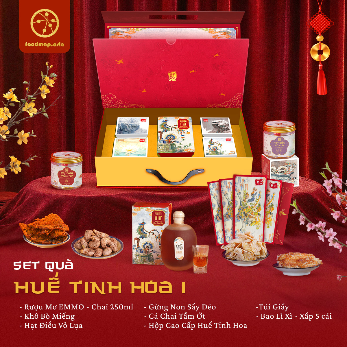SET QUÀ HUẾ TINH HOA 1 là bộ quà Tết cao cấp lấy cảm hứng từ ẩm thực Cố đô Huế, kết hợp hài hòa giữa rượu mơ thanh nhã, đặc sản khô – hạt – mứt truyền thống, mang thông điệp tinh tế – trầm lắng – thịnh vượng. Set quà phù hợp làm quà biếu doanh nghiệp, đối tác quan trọng và người thân trong dịp Tết Nguyên Đán.